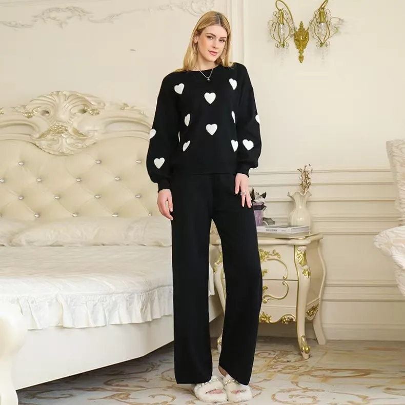 Fall New Arrival: Round Neck Heart Print Long Sleeve Oversized Knit Sweater + High-Waisted Wide-Leg Pants Two-Piece Set for Women